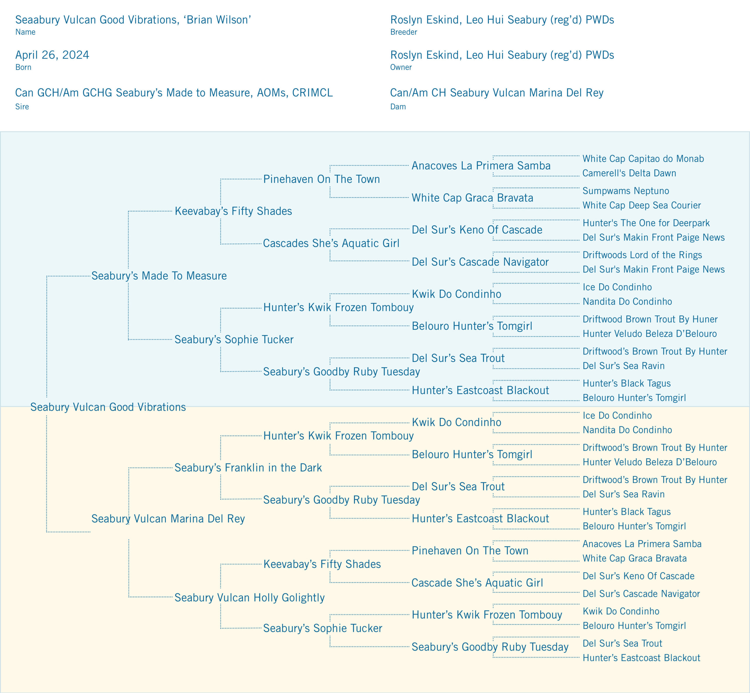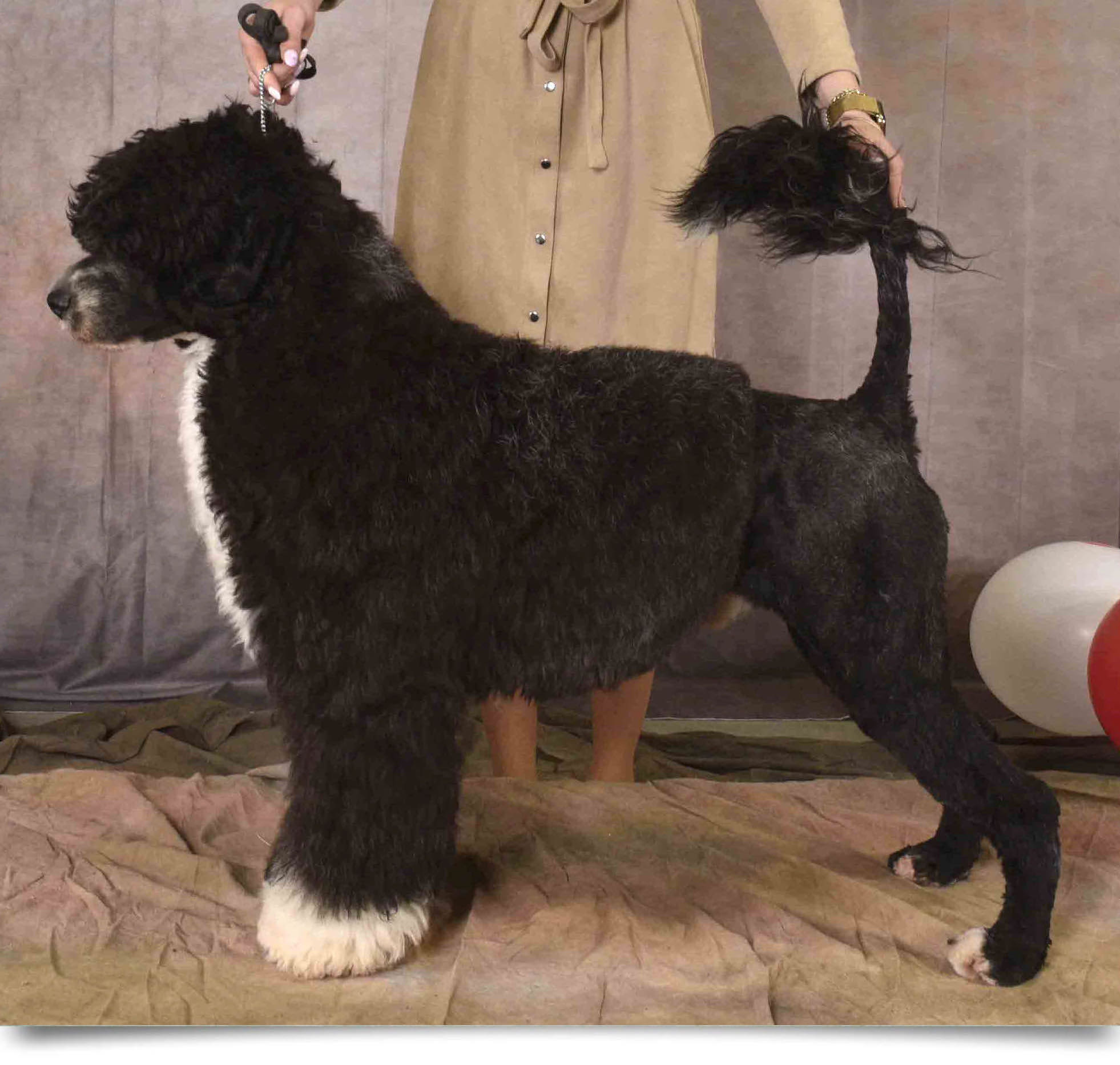 Brian Wilson attained his American Championship at the Florida circuit with Joanne Thibault, warming up the first week, finishing the second week, at 7 months. He returned to Canada and finished quickly with Natalie Bridgette and Mélodie-Ann Guerit. He’s a group winning and multi placing pup. Brian is very much like his sire, Taylor, a black almost Irish marked wavy boy, who’s lots of fun. He will be going to the 2025 PWDCA National to show as a special and in Brace with Taylor.